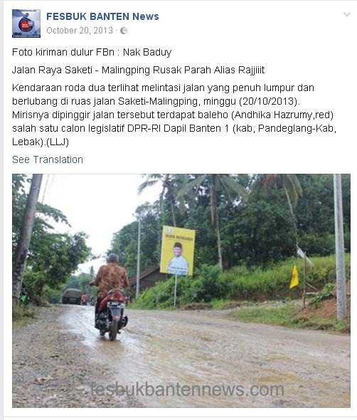 A two-wheeler is seen riding along a road full of mud and potholes between Saketi–Malingping on Sunday (20/10/2013).  Ironically, on the side of the road there is a billboard (for Andhika Hazrumy [Ratu Atut’s son]) for a national legislative election candidate from Banten Area 1 (Pandeglang and Lebak Regency). (LLJ)