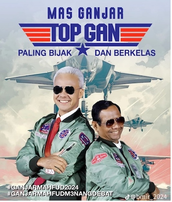 Buzzer operations also appeared in support of Ganjar-Mahfud. For instance, at the third debate on 7 January 2024, seconds after the pair appeared on stage donning matching outfits (doing so at each of the debates, a trademark of their campaign) – this time, wearing bomber jackets and pilot’s sunglasses, mimicking Hollywood actor Tom Cruise’s look in the action movie Top Gun – many tweets were posted with ready-made memes featuring the pair as ‘Top Gan’ (‘Gan’ for Ganjar). These posts, too, while made to appear as shared by genuine supporters, carried strikingly similar messages along the lines of Ganjar’s campaign slogan ‘sat-set’, meaning that they will get the job done fast. For Anies-Muhaimin such well-prepared buzzer operations on Twitter also occurred but were less common, as they appeared to receive genuine support on the platform.